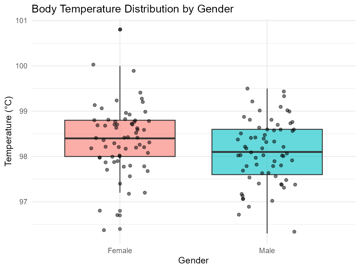 ggplot(aes(x = gender, y = temperature, fill = gender)) +
